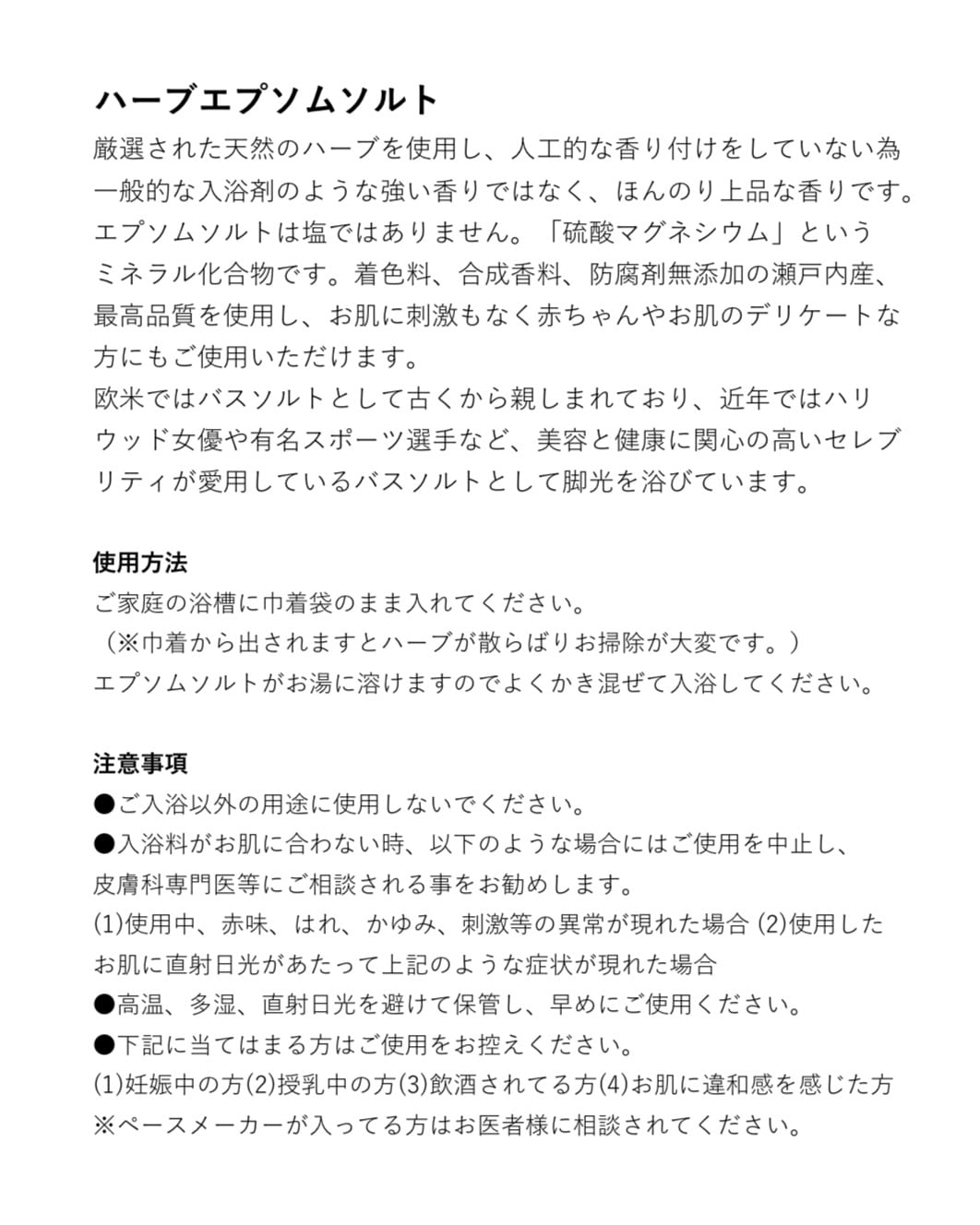 こちらの商品は、選りすぐりのエプソムソルトとともに、3種類のハーブが心地よい香りをもたらし、風呂上がりのリフレッシュ感を高めます!